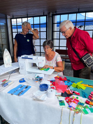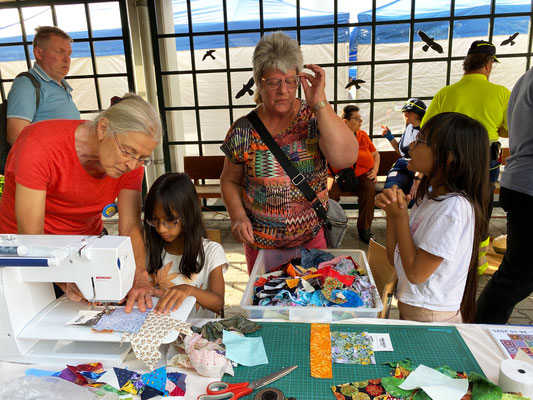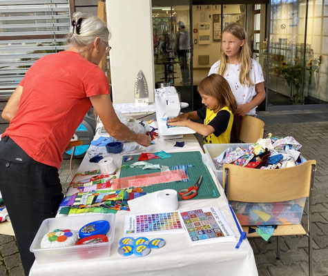 Um die Besucherinnen und Besucher etwas neugierig zu machen, wurde eine Nähmaschine installiert. Darauf wollten wir möglichst viele Streifen mit Kassenrollen nähen produzieren. Ziel war es, dass möglichst viele Gäste – ob Frauen, Männer oder Kinder – fleissig nähten. Diese Streifen werden wir für unseren Wettbewerb an der Ausstellung verwenden.