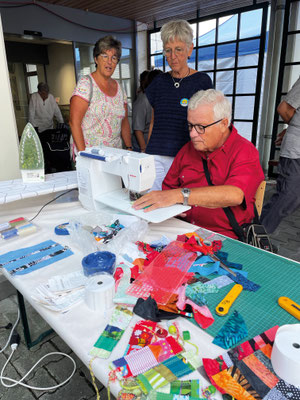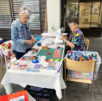 Petrus hatte ein Einsehen und wir konnten beim schönsten Wetter unseren Stand einrichten. Marianne Hodel und Erika Raaflaub brachten einiges an Anschauungsmaterial zum Thema Patchwork mit und an einem Ständer war eine Bettdekke von Marianne Hodel der Hingucker.
