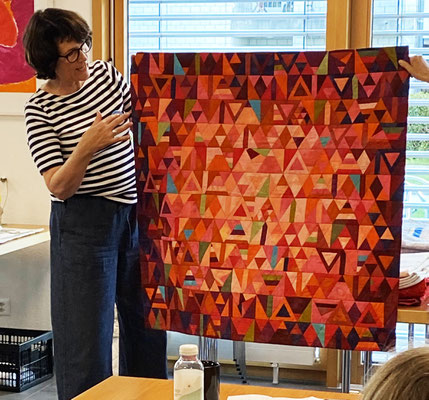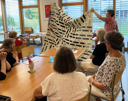 · Monika Walther erzählte uns ihre Patchworklaufbahn. Sie liebte schon während ihrer Schulzeit das Handarbeiten sehr. Ihren ersten Quilt nähte sie 2009, es folgten bis heute viele schöne Werke. Mich beeindruckt Monikas Gespür für Farbharmonien sehr. Nebst klassisch genähten Quilts brachte uns Monika die Technik mit Keilrahmen näher.